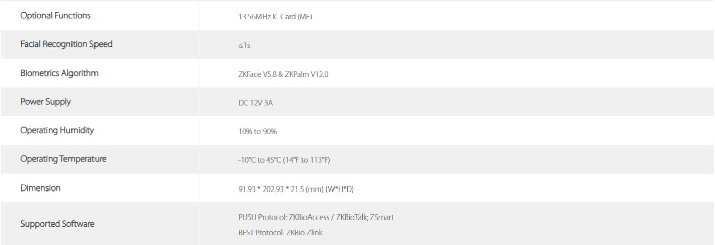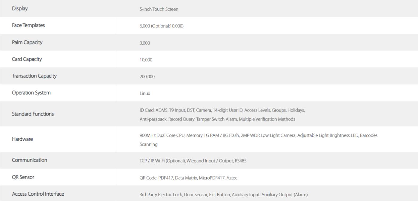 SpeedFace-V5L[QR] is an upgraded version of the SpeedFace-V5L Visible Light Facial Recognition Terminal, using intelligent engineering facial recognition algorithms and the latest computer vision technology. It supports a multi-factor identity authentication system by using QR Codes and acquired face / palm data for computational template matching. Besides, the terminal offers large capacity and speedy recognition. SpeedFace-V5L[QR] is powered by the QR Code Scanner that reads barcodes, such as QR codes, PDF417, Data Matrix, MicroPDF417, Aztec, presented on our ZKBioSecuity Mobile App for T&A / A&C. What’s more? The terminal adopts touchless recognition technology and supplementary functions namely masked individual identification, which eliminates hygiene concerns effectively. It is also equipped with an antispoofing algorithm for facial recognition against almost all types of fake photos and videos attack. Importantly, the 3-in-1 palm recognition (Palm Shape, Palm Print and Palm Vein) is performed in 0.35s per hand; the palm data acquired will be compared with a maximum of 3,000 palm templates.