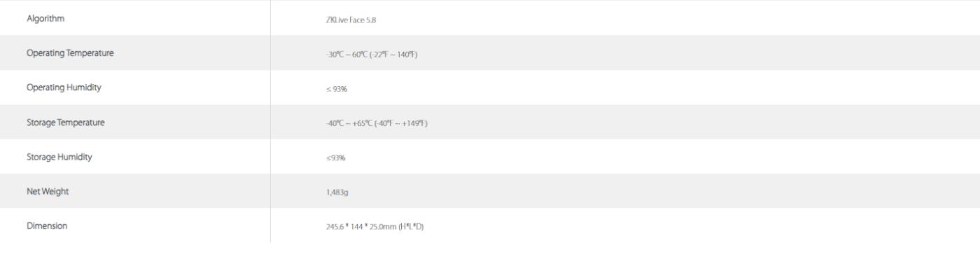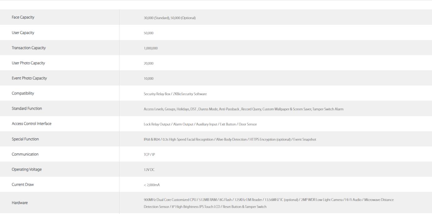 Elite Access is a new high-level facial recognition terminal with extremely powerful facial recognition capability supported with ZKTeco’s customized powerful CPU and ultra-large capacity of facial templates, a maximum of 50,000 facial templates for 1:N recognition. With its powerful core and the latest facial recognition algorithm, Elite Access rapidly recognizes a face within 0.3 second, while e ectively preventing any kinds of print attack with its strong anti-spoofing algorithm.
