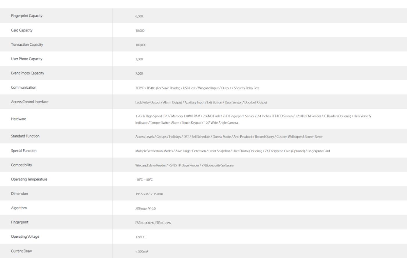 ProCapture-T is an access control terminal applying the most advanced Z-ID fingerprint sensor. Its outstanding performance provides a high identification rate towards dry, wet and rough fingers, being capable to detect alive finger for a higher security level. The fingerprint verification speed has been dramatically increased by its optimized fingerprint algorithm and the brand new ZMM220 hardware platform, equipped with a fast 1.2GHz processor.