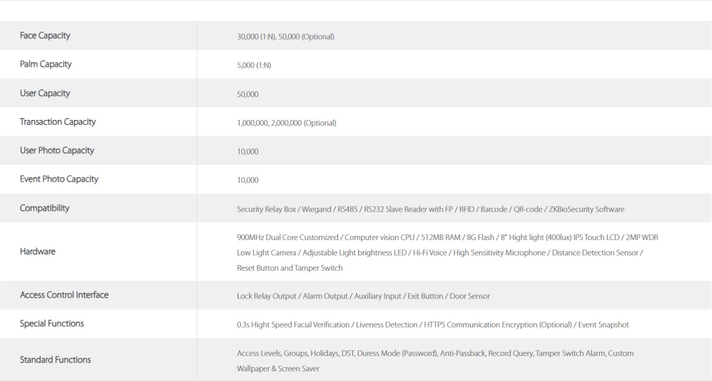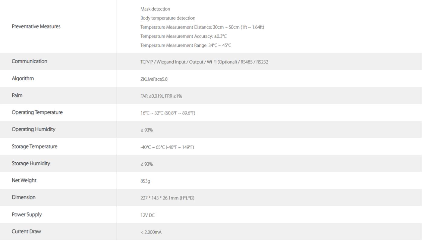 ProFace X [TD] is a fully upgraded version of the ProFace product line, which is designed to deal with all kinds of scenarios. Powered by the ZKTeco-customized CPU for running the intellectualized engineering facial recognition algorithm and the latest computer vision technology, ProFace X [TD] supports both facial and palm verification with large capacity and rapid recognition speed, boosting the security performance in all aspects.
