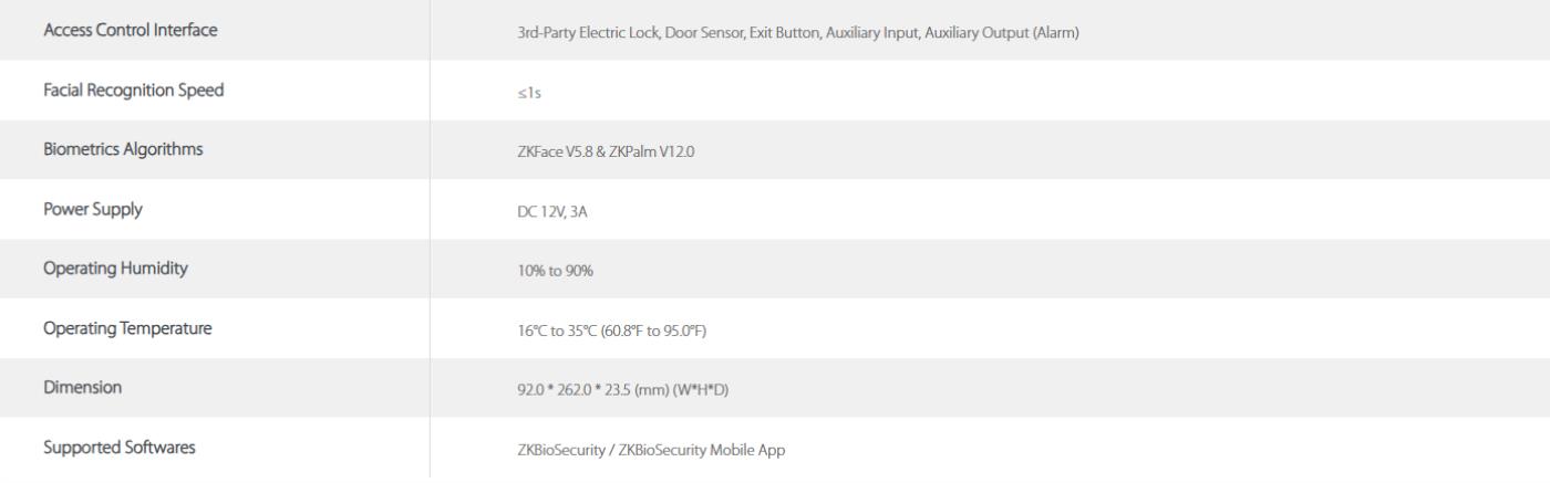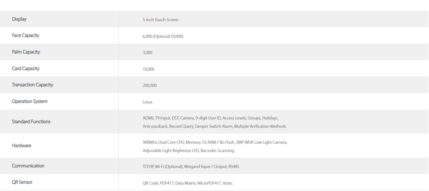 SpeedFace-V5L[QR][TI] is an upgraded version of the SpeedFace-V5L[QR] Visible Light Facial Recognition Terminal, using intelligent engineering facial recognition algorithms and the latest computer vision technology. It supports a multi-factor identity authentication system by using QR Codes and acquired face/palm data for computational template matching. Besides, the terminal offers large capacity and speedy recognition.
