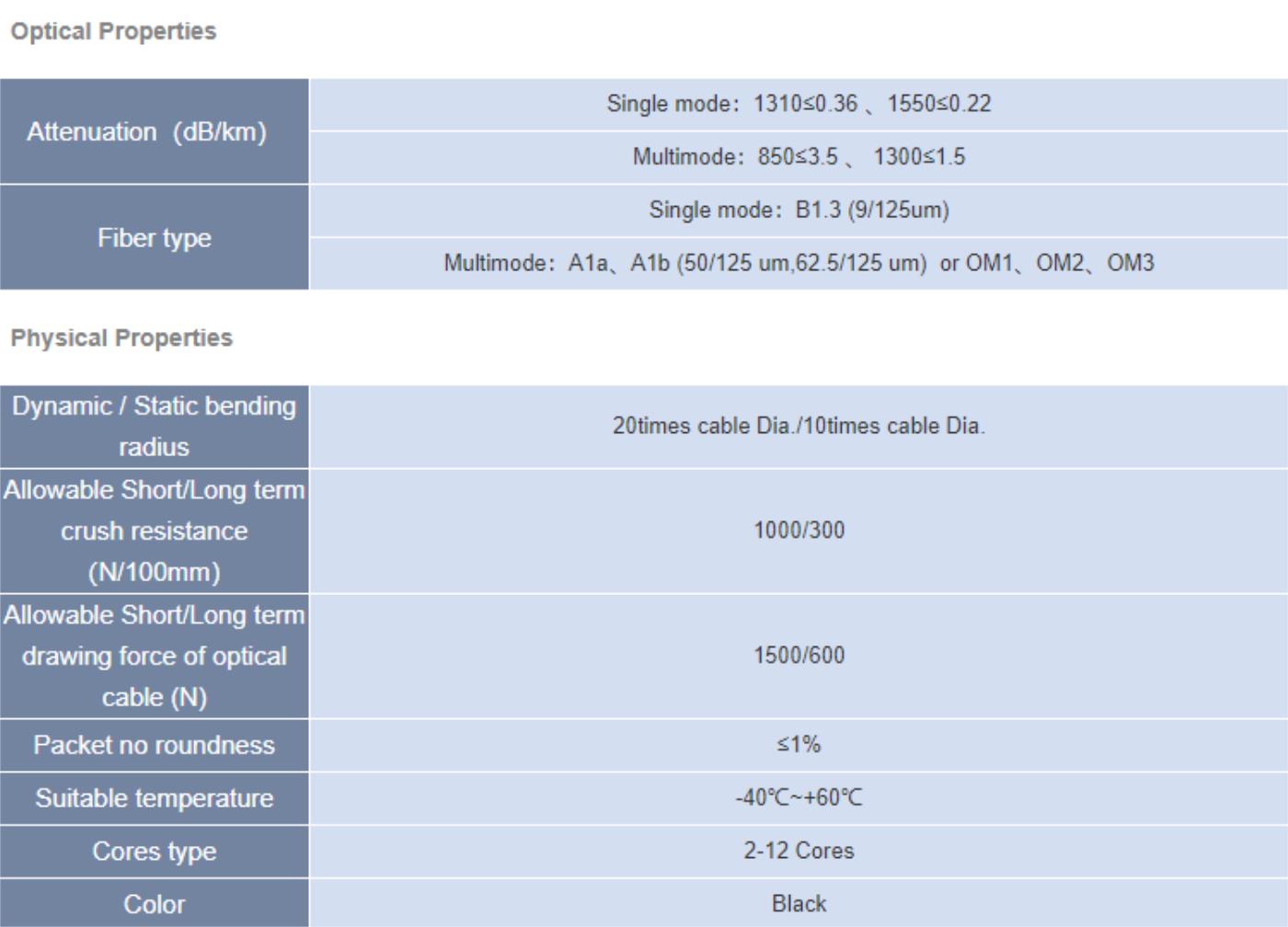 2. Excellent mechanical properties and environmental performances due to reasonable design and precision control of the redundant length of the optical fiber in the loose tube.