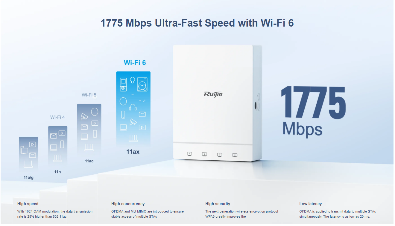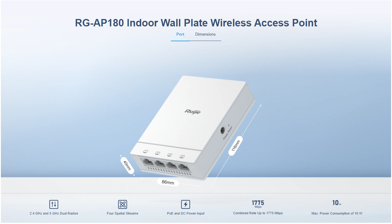 Wall Plate Wi-Fi 6 (802.11ax) Access Point, standard size of 86-type faceplate, built-in antenna, dual-radio dual-band, support 574.5Mbps @2.4G and 1.2Gbps @5G, up to 4 spatial streams and 1774.5Mbps access rate per AP, support concurrent 802.11a/b/g/n/ac and 802.11ax, FAT/FIT mode, PoE+ and local power supply, bundled with Ruijie Cloud Service lifetime license (Power adaptors for PoE+, local power supply, US/EU mount kit are sold separately)