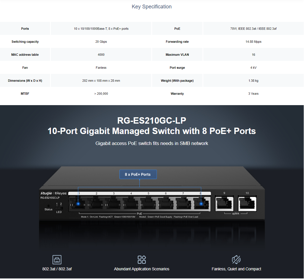 10-Port Gigabit Smart POE Switch, 8 PoE/POE+ Ports with 2 Gigabit RJ45 uplink ports, 70W PoE power budget, Desktop Steel Case