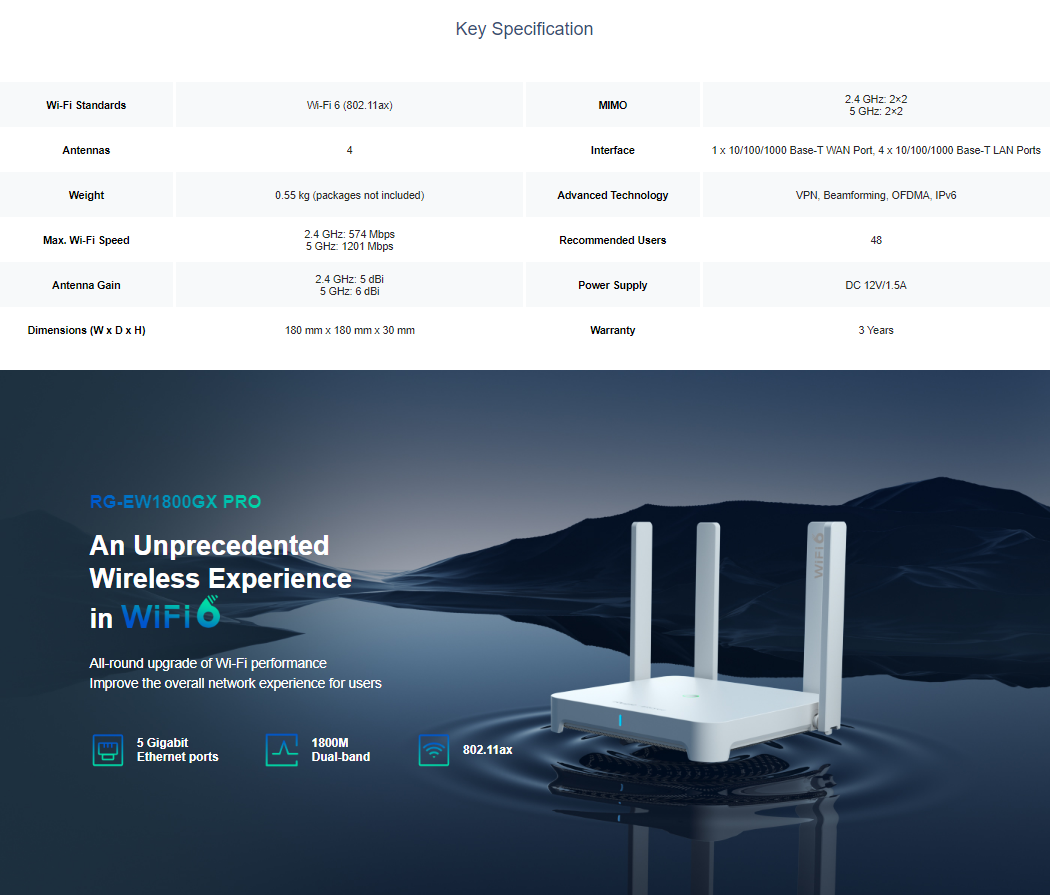 Wireless access: dual-band 1800Mbps, Wired access: 5 Gigabit ports, including 1 WAN port and 4 LAN ports;
