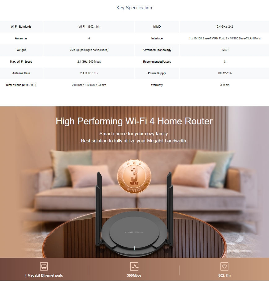 Wired access: 4 FE ports, including 1 WAN port and 3 LAN ports;