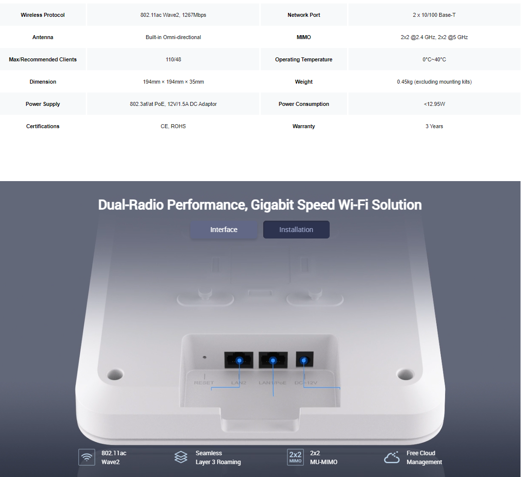 AC1300 Dual Band Ceiling Mount Access Point, 867Mbps at 5GHz + 400Mbps at 2.4GHz, 2 10/100base-t Ethernet uplink port, Internal Antennas,support 802.11a/b/g/n/ac Wave1/Wave2, 2×2 MIMO, Maximum power consumption <13W. The power supply output should higher than AP max power consumption.