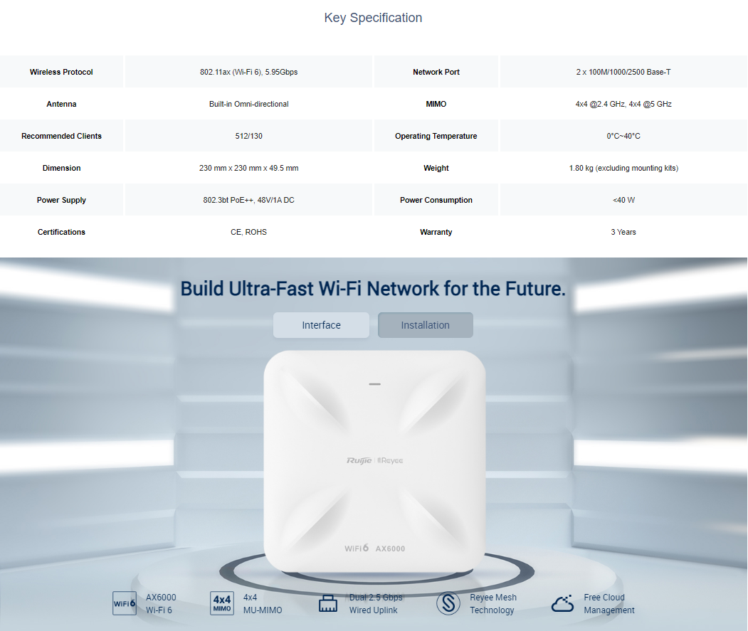 AX6000 Wi-Fi 6 dual-band Gigabit ceiling mount Indoor AP, 2.5 Gigabit LAN uplink ports, built-in antennas, dual-band 2.4GHz/5GHz, 802.11ax, up to 5952 Mbps access rate per AP; support AP and routing mode, Layer 3 roaming, Reyee unified networking and Ruijie Cloud app management; Local power supply, DC 48V/1A (Note: The power adapter is sold as an optional accessory), 802.3bt PoE.Max power consumption <40W. The power supply output should higher than AP max power consumption.