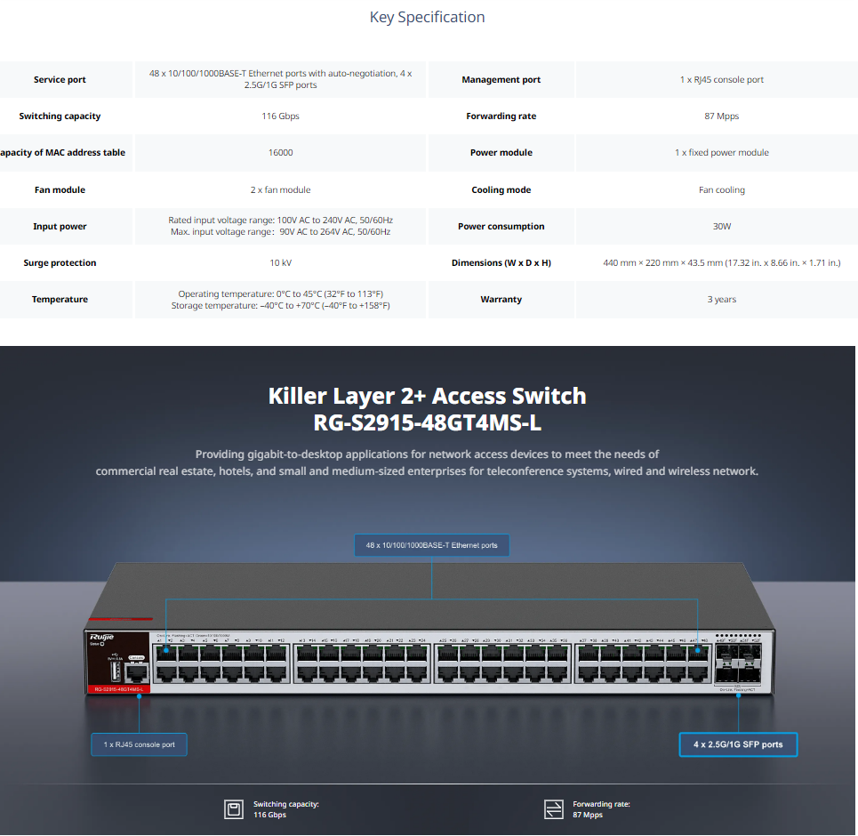 48 × 10/100/1000Base-T copper ports with auto-negotiation, 4 × 1GE/2.5GE SFP ports, 2 built-in fixed fan, fixed single AC power supply
